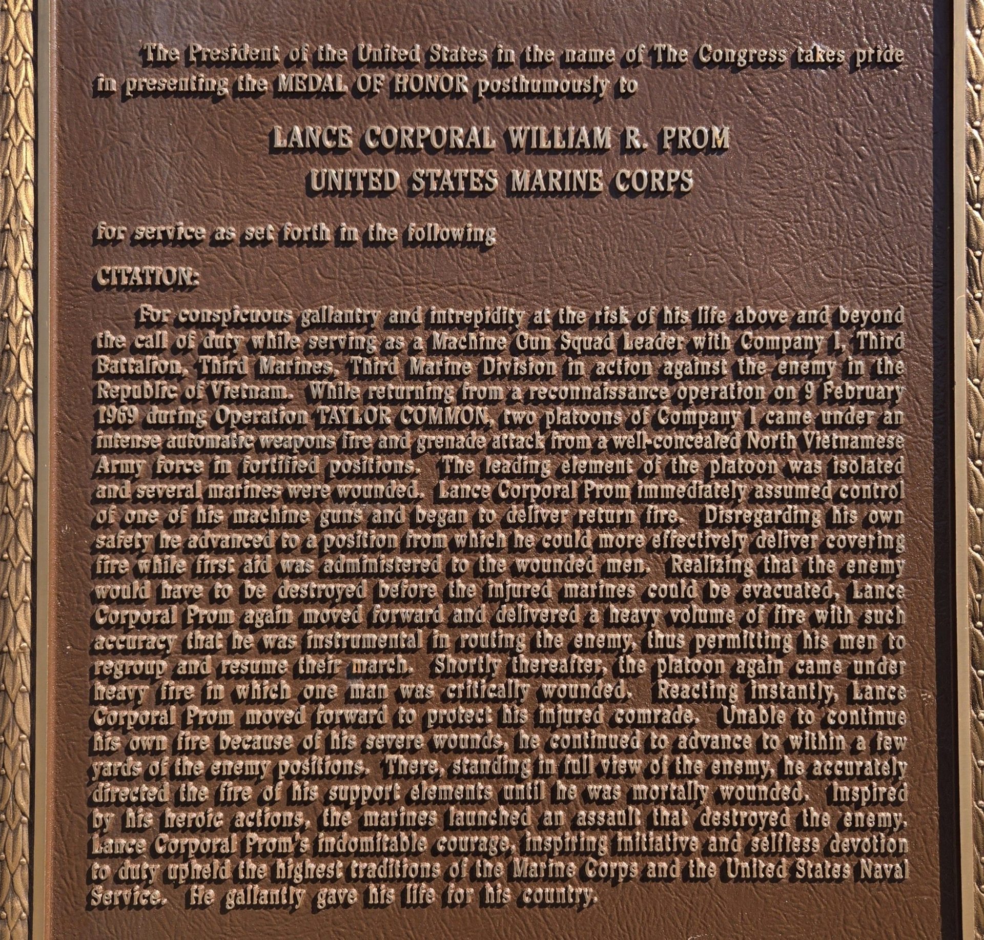 WILLIAM R. PROM MEDAL OF HONOR WAR MEMORIAL PLAQUE B