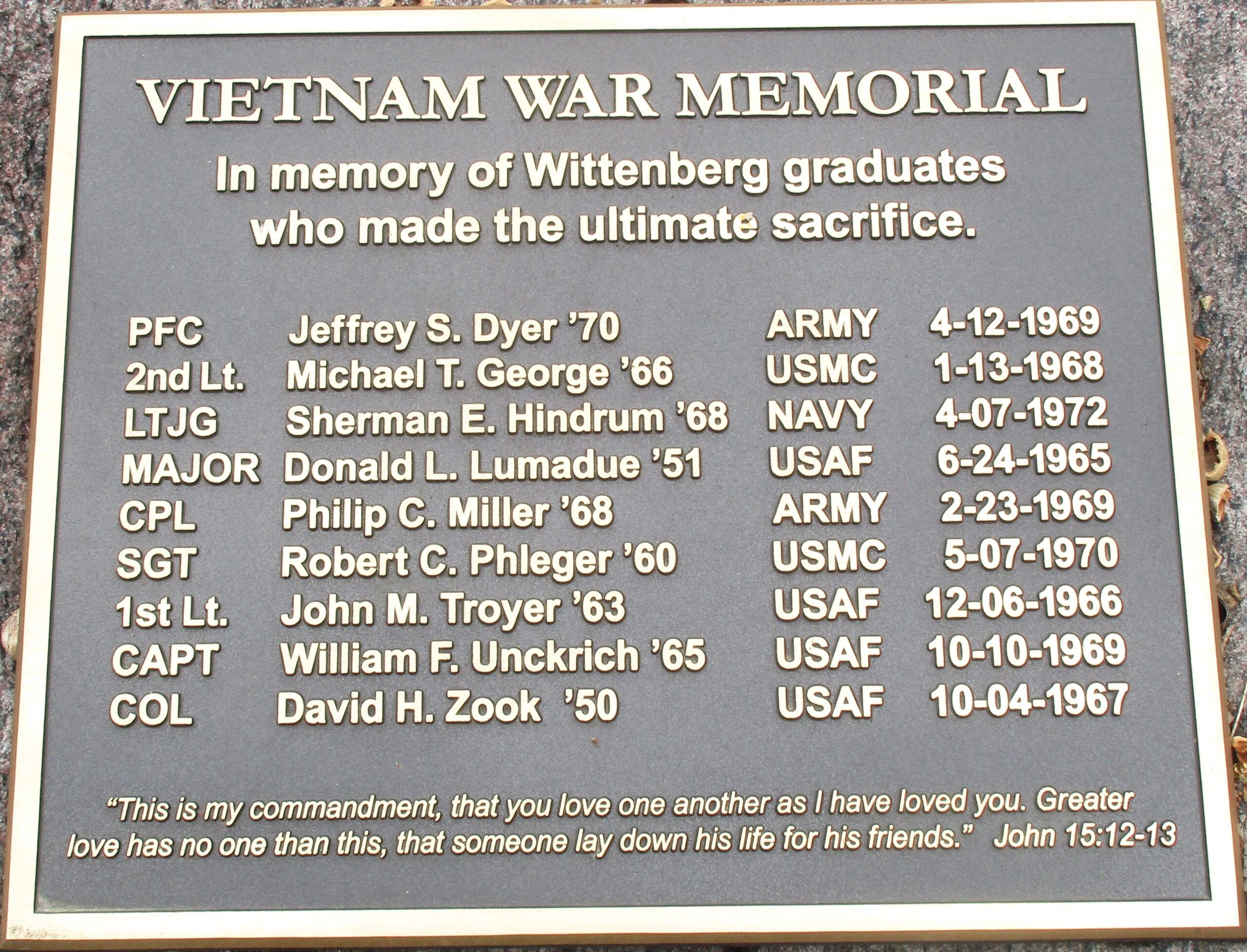 WITTENBERG GRADUATES VIETNAM WAR MEMORIAL PLAQUE
