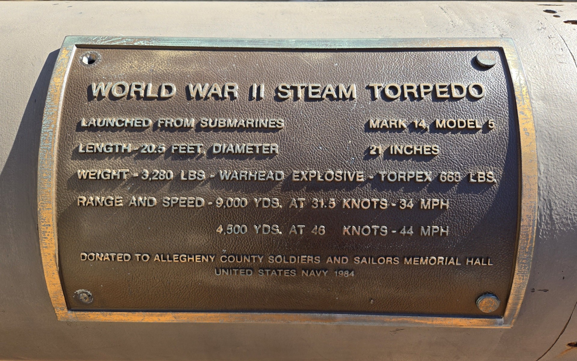 WORLD WAR II STEAM TORPEDO MEMORIAL PLAQUE