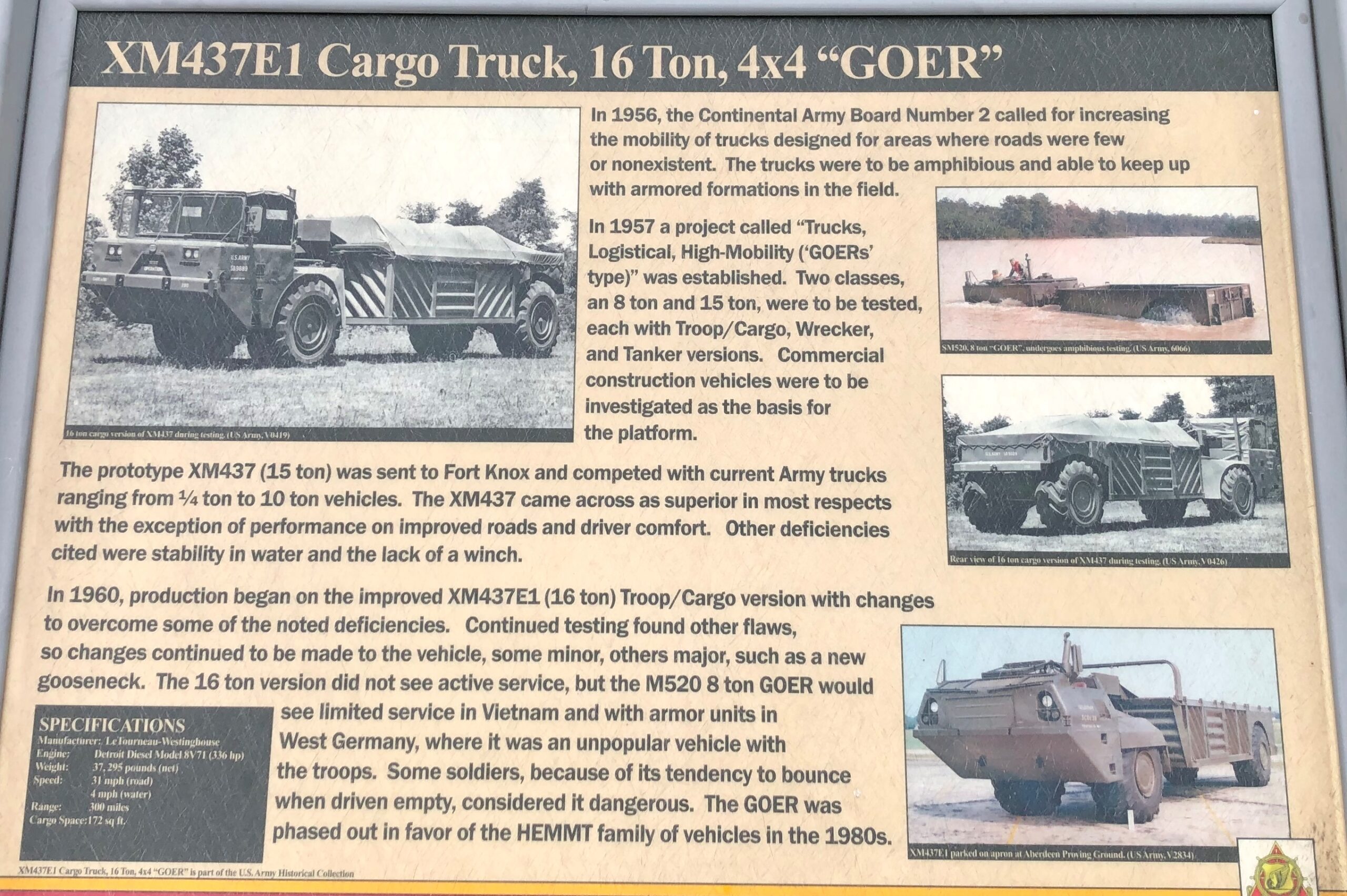 XM437E1 CARGO TRUCK, 16 TON, 4X4 “GOER” MEMORIAL PANEL