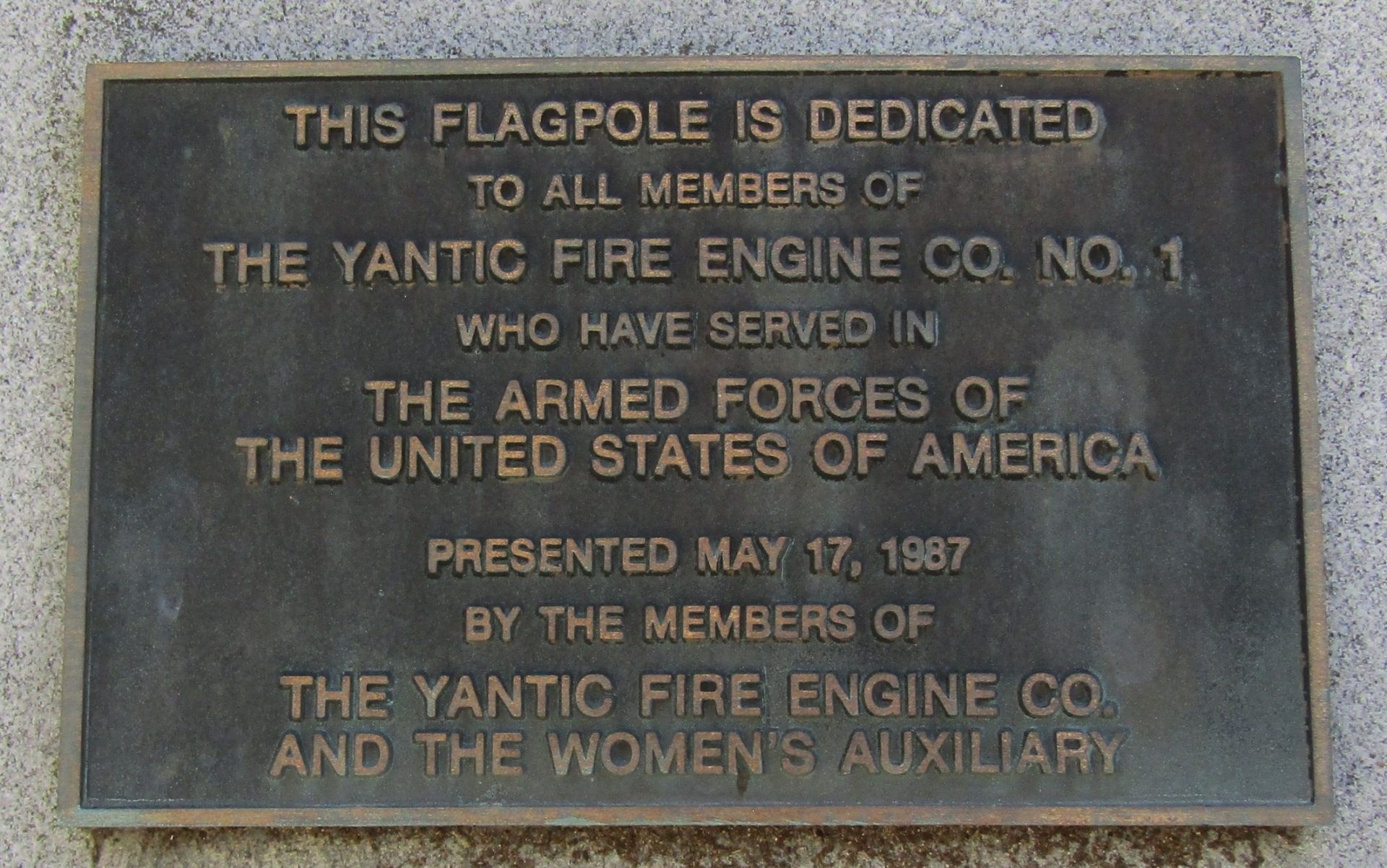 YANTIC FIRE ENGINE CO. NO. 1. ARMED FORCES MEMORIAL FLAGPOLE PLAQUE