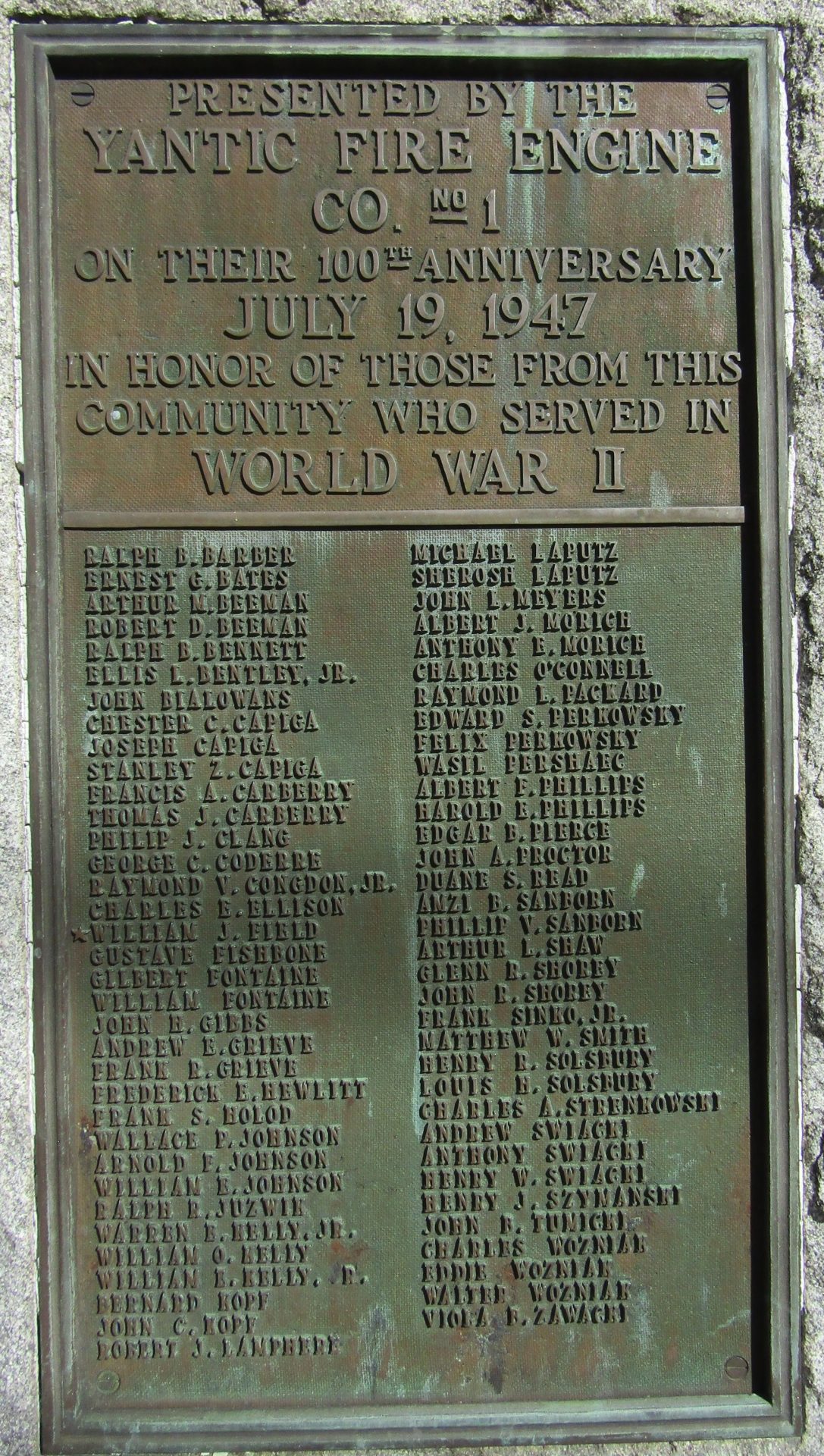 YANTIC FIRE ENGINE CO. NO 1 WORLD WAR II VETERANS MEMORIAL PLAQUE