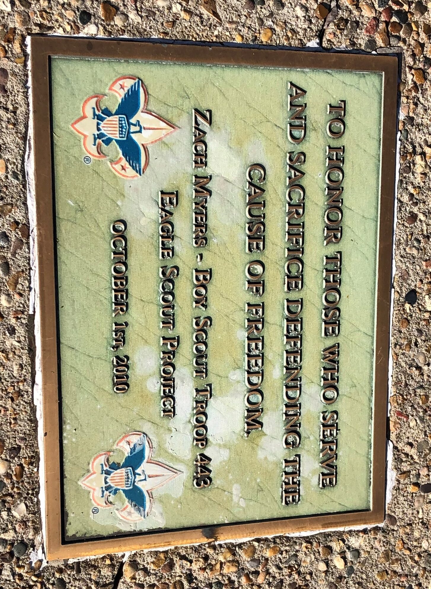 ZACH MYERS BOY SCOUT 443 EAGLE SCOUT PROJECT VETERANS MEMORIAL CANNON PLAQUE